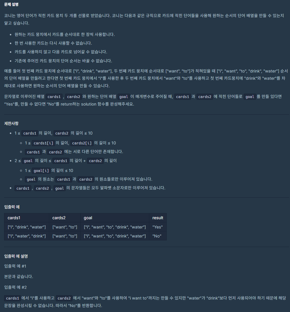 - goal에 있는 단어를 순회하며 두 카드 뭉치의 맨 앞에 있는 단어가 일치하는 경우 꺼내서 사용한다.