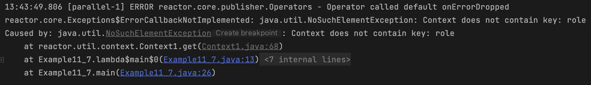 주석되어있는 부분을 살펴보면 ctx.get("role") 구문으로 Inner Sequence에 세팅된 Context 값을 가져오려고 한다는 것을 알 수 있다. 만약 이 주석을 해제한다면 다음과 같이 role을 key값으로 하는 Context 값이 존재하지 않기 때문에 NoSuchElementException이 발생하게 된다.