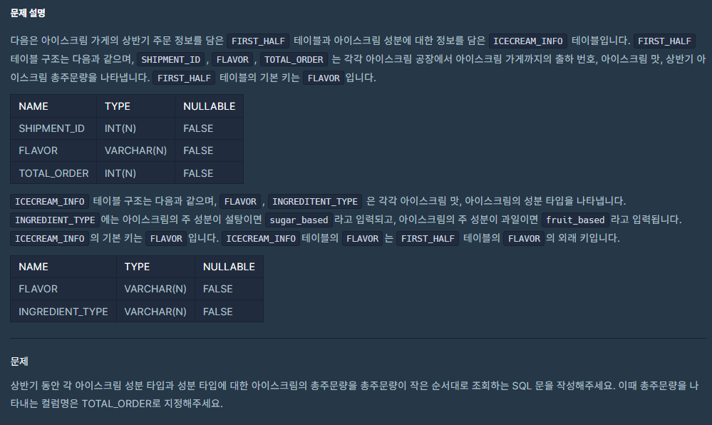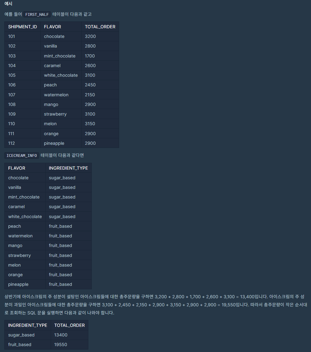JOIN을 통해 각 FLAVOR의 INGREDIENT_TYPE을 구한 뒤, 그 타입별로 TOTAL_ORDER의 합계를 구해야 한다.