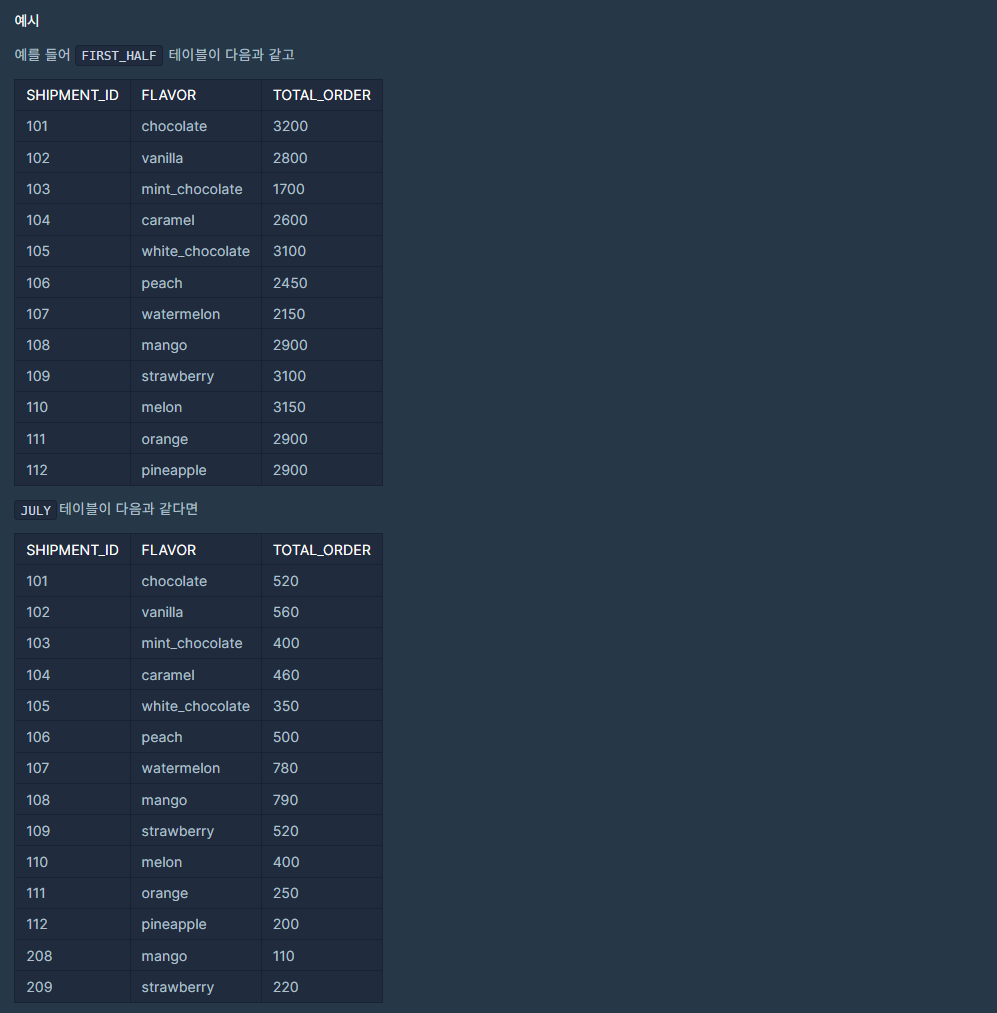 FIRST_HALF는 FLAVOR가 중복된 행이 없지만, JULY 테이블에는 같은 FLAVOR가 존재할 수 있다.