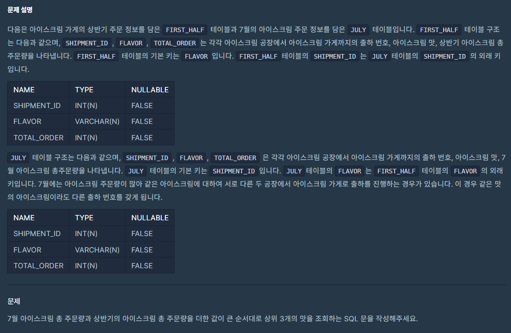 따라서 JULY 테이블 기준으로 FLAVOR를 그룹화하여 TOTAL_ORDER를 SUM 집계 함수로 다시 계산한 다음, FIRST_HALF와 조인하여 구하면 된다.