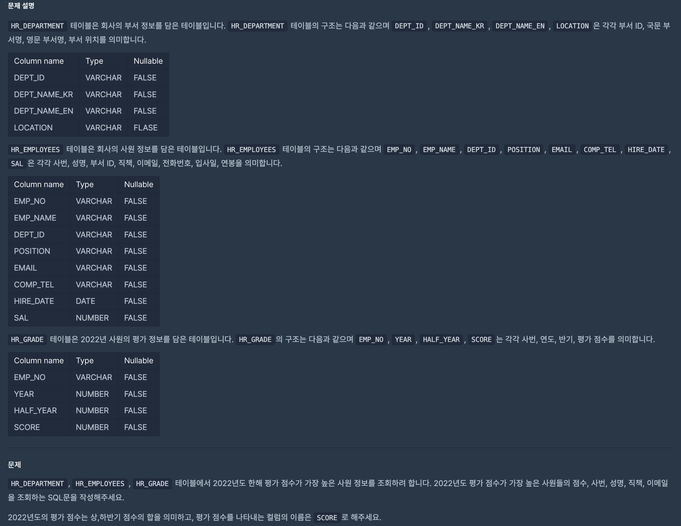 HR_DEPARTMENT 테이블은 문제 해결을 위해 불필요하다. 따라서 HR_EMPLOYEES, HR_GRADE 두 테이블로 문제를 해결할 수 있다.