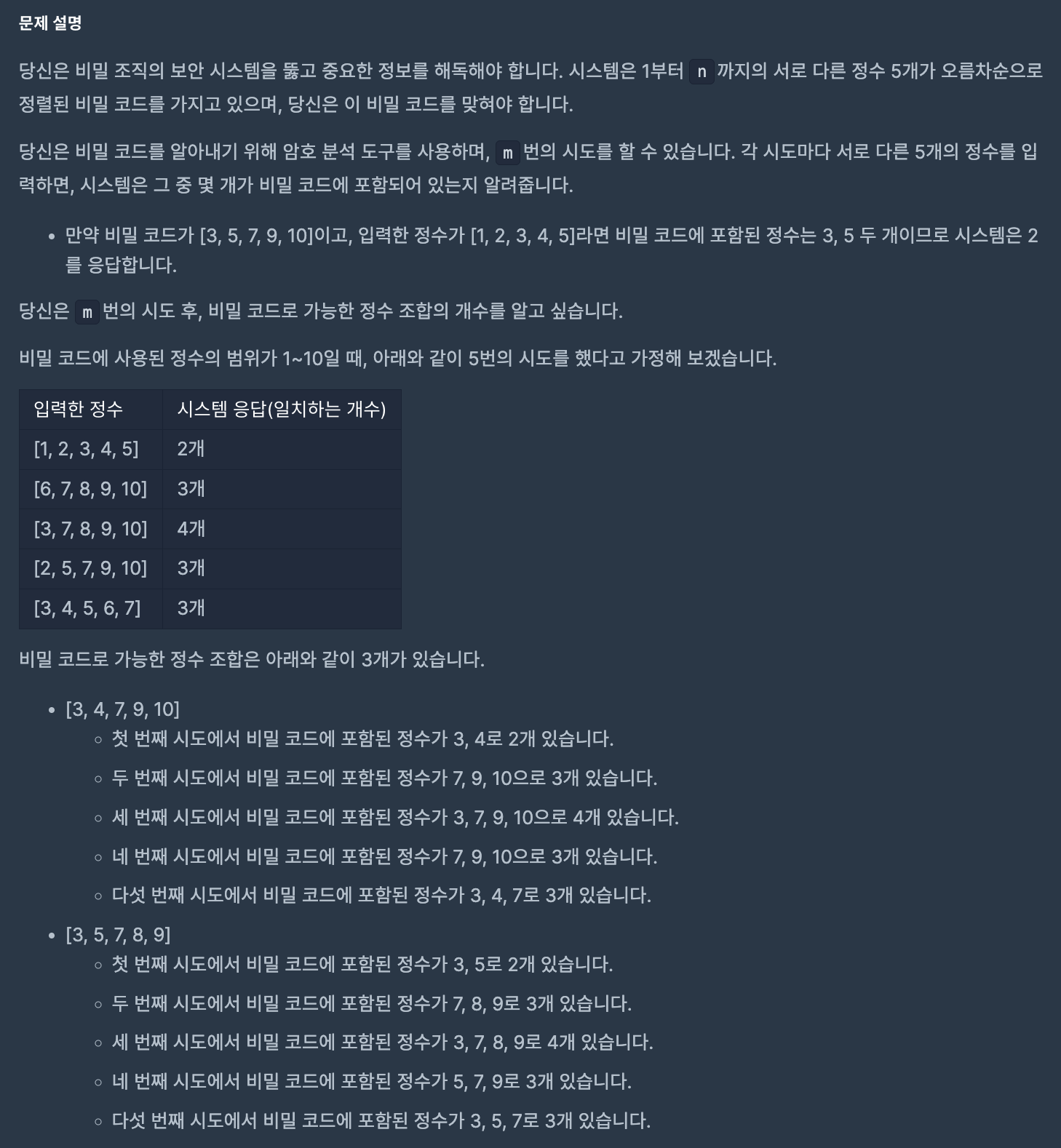조합을 만든 뒤, q랑 비교해보며 ans 와 같은 결과가 나오는 조합이면 비밀 코드에 해당된다.