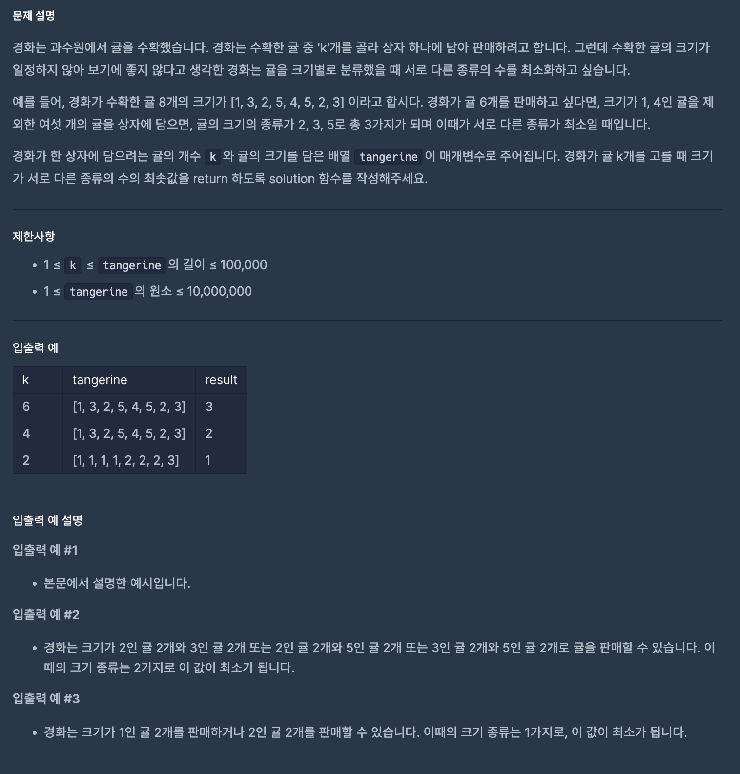- 개수가 가장 많은 종류부터 선택하여 k에서 선택한 종류의 개수를 뺀다.