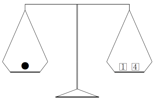 <그림 1> 구슬이 3g인지 확인하는 방법 (1은 1g인 추, 4는 4g인 추, ●은 무게를 확인할 구슬)
