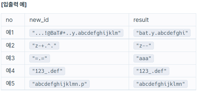 카카오에 입사한 신입 개발자 네오는 "카카오계정개발팀"에 배치되어, 카카오 서비스에 가입하는 유저들의 아이디를 생성하는 업무를 담당하게 되었습니다. "네오"에게 주어진 첫 업무는 새로 가입하는 유저들이 카카오 아이디 규칙에 맞지 않는 아이디를 입력했을 때, 입력된 아이디와 유사하면서 규칙에 맞는 아이디를 추천해주는 프로그램을 개발하는 것입니다.