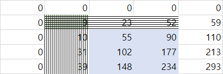 그렇다면 인덱스 0,0 부터 파란색 영역 오른쪽 아래까지의 합에 해당하는 234를 더해주고,