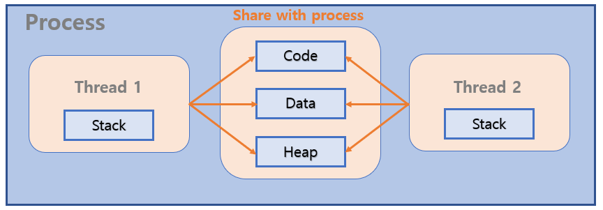 - 프로세스의 Code, Data, Heap은 공유하고 Stack 부분만 각각의 스레드에 할당됨
