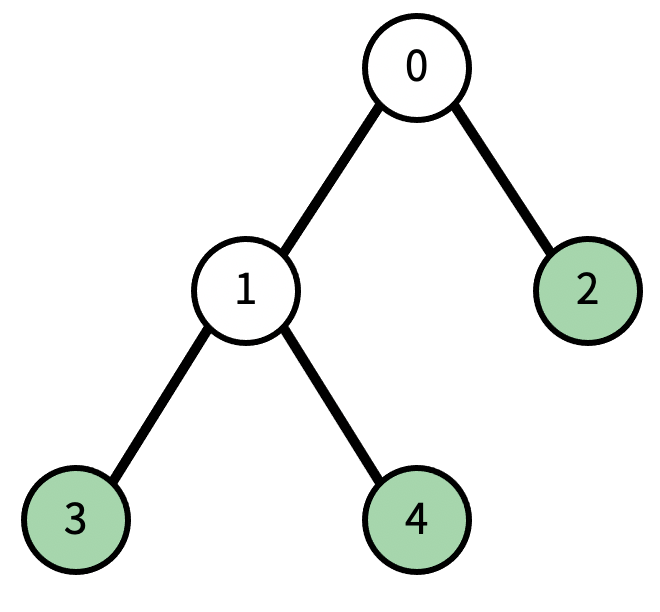 현재 리프 노드의 개수는 3개이다. (초록색 색칠된 노드) 이때, 1번을 지우면, 다음과 같이 변한다. 검정색으로 색칠된 노드가 트리에서 제거된 노드이다.