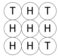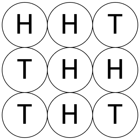 N2개의 동전이 N행 N열을 이루어 탁자 위에 놓여 있다. 그 중 일부는 앞면(H)이 위를 향하도록 놓여 있고, 나머지는 뒷면(T)이 위를 향하도록 놓여 있다. <그림 1>은 N이 3일 때의 예이다.