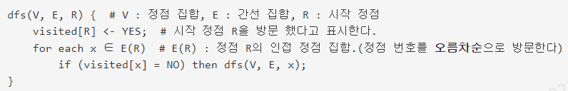 깊이 우선 탐색 의사 코드는 다음과 같다. 인접 정점은 오름차순으로 방문한다.