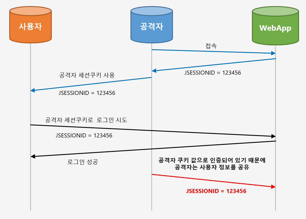 - 공격자가 서버에서 발급받은 JSESSIONID(세션쿠키)를 사용자에게 심어 놓음