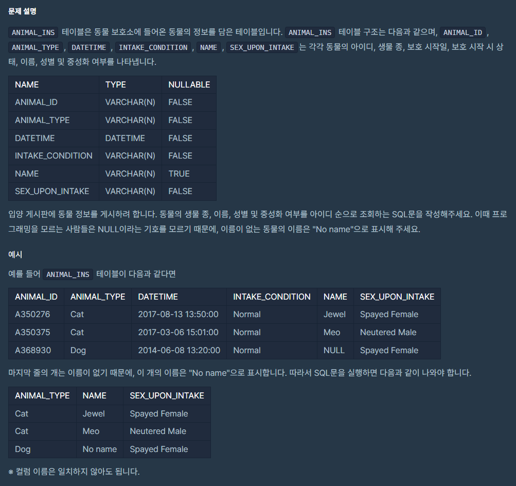 NAME이 NULL인 경우 "No name" 이라는 값으로 대체해서 조회해야 한다.