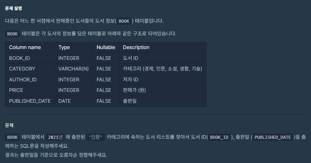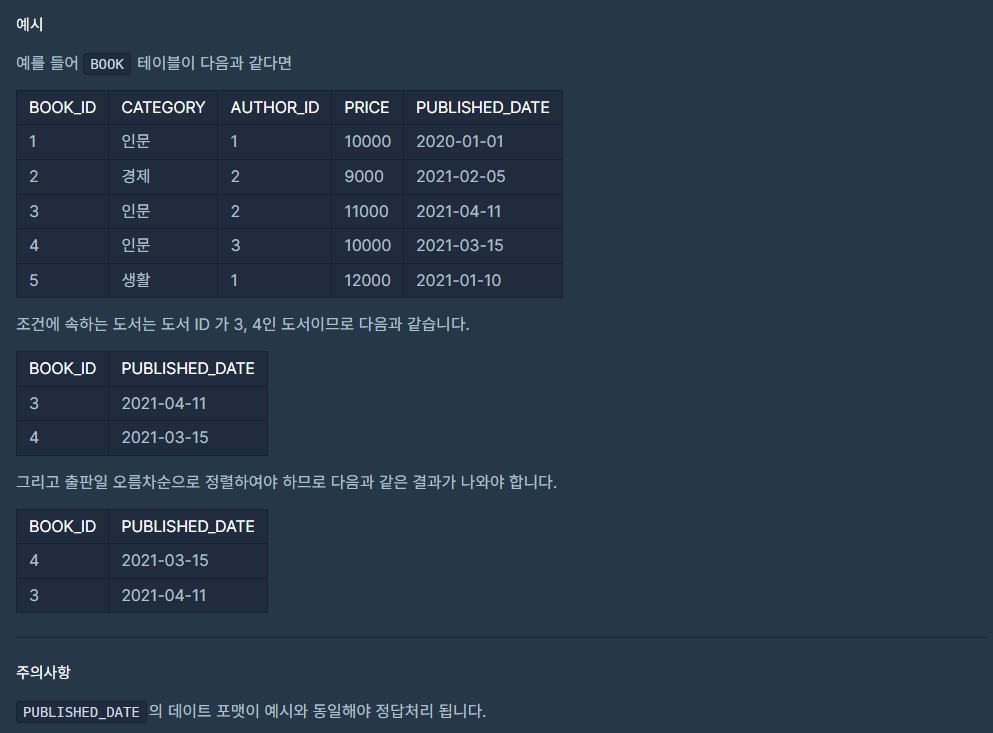 PUBLISHED_DATE의 연도가 2021이면서 CATEGORY가 '인문'인 데이터를 조회해야 한다. PUBLISHED_DATE의 출력 형식을 맞추기 위해 DATE_FORMAT을 사용해야 한다.