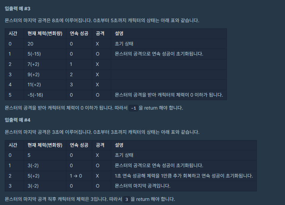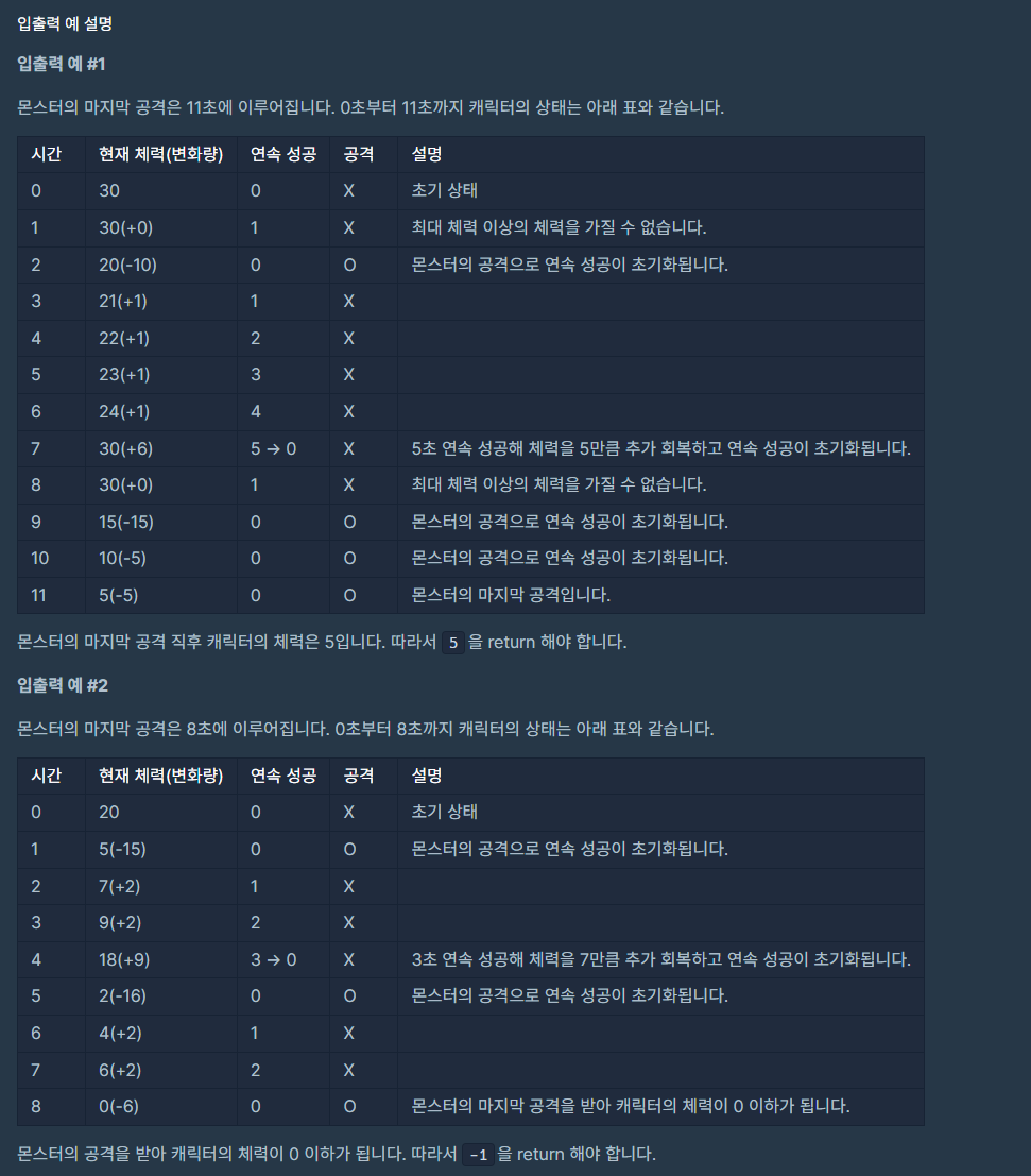 마지막 공격 시간을 배열에서 구해 for문으로 초 단위로 순회하며 시뮬레이션 하며 해결했다.