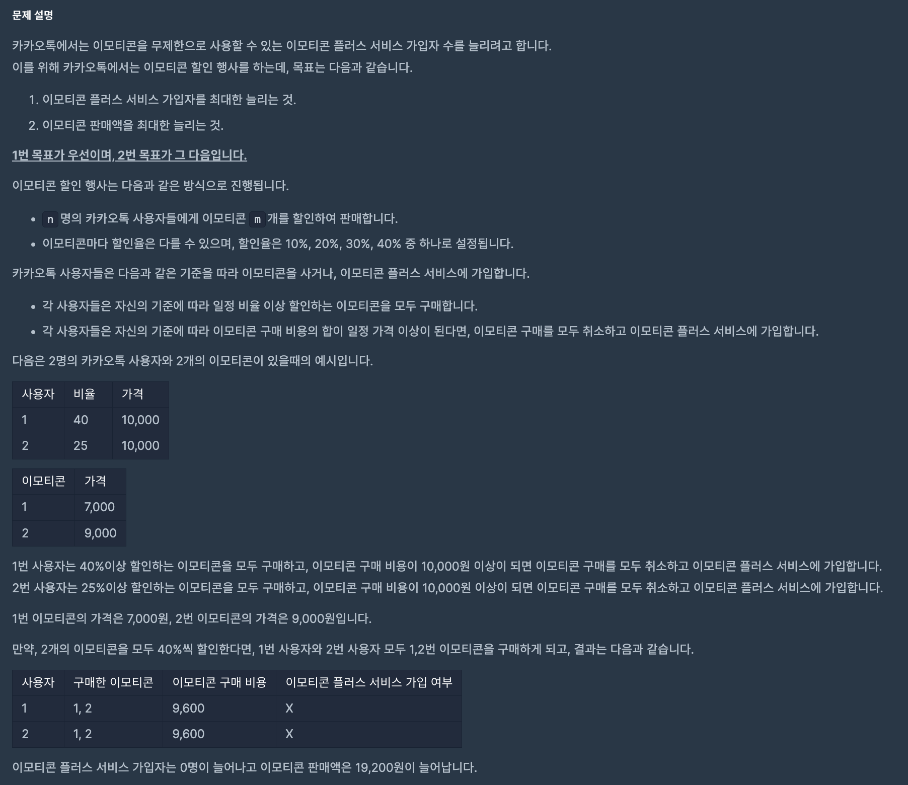 - 현재 할인율의 조합에 대해 이모티콘 서비스의 가입 여부와 판매액을 구했으므로 다음의 규칙을 수행한다.