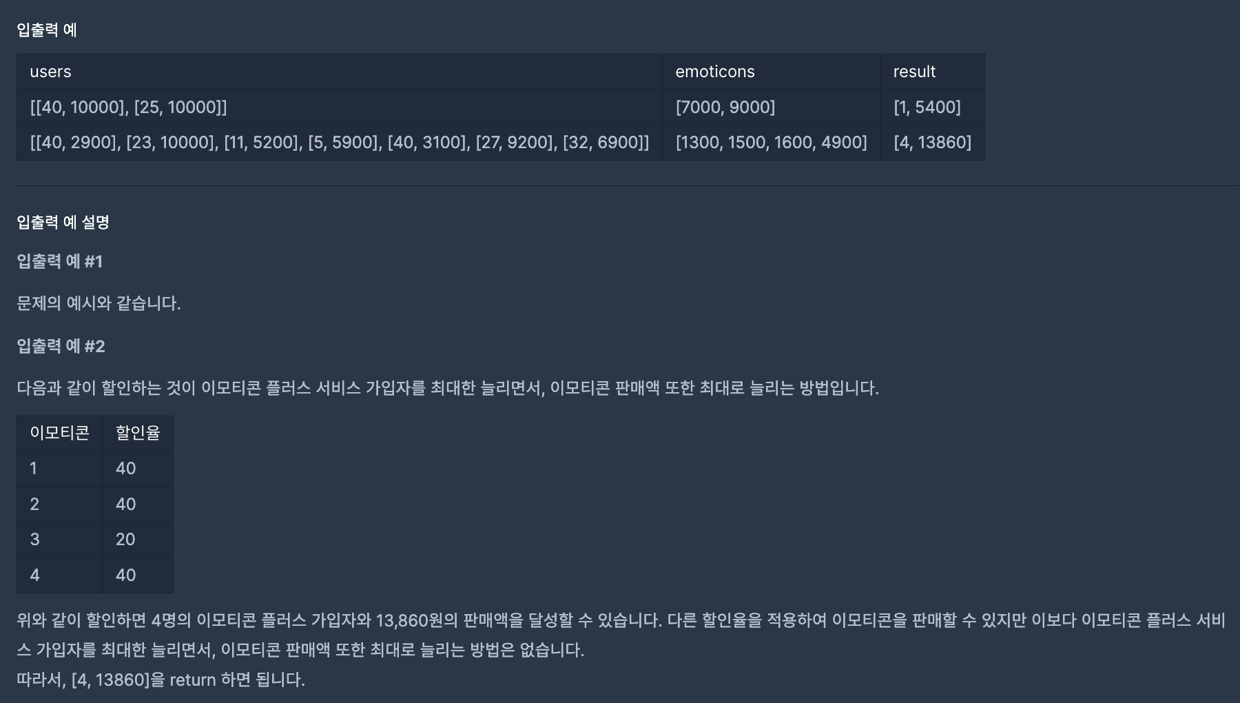 각 이모티콘의 할인율을 적절하게 정하여 최대의 이모티콘 플러스 가입자를 유치하고, 그 때 최대의 이익을 출력해야 한다.
